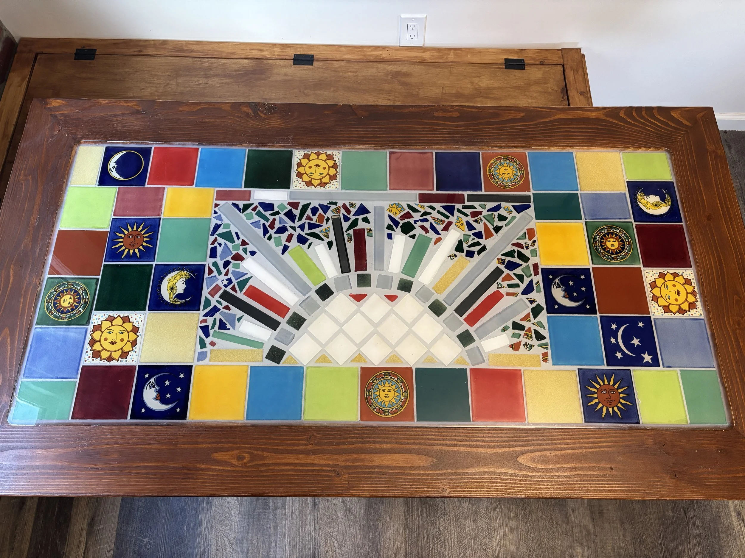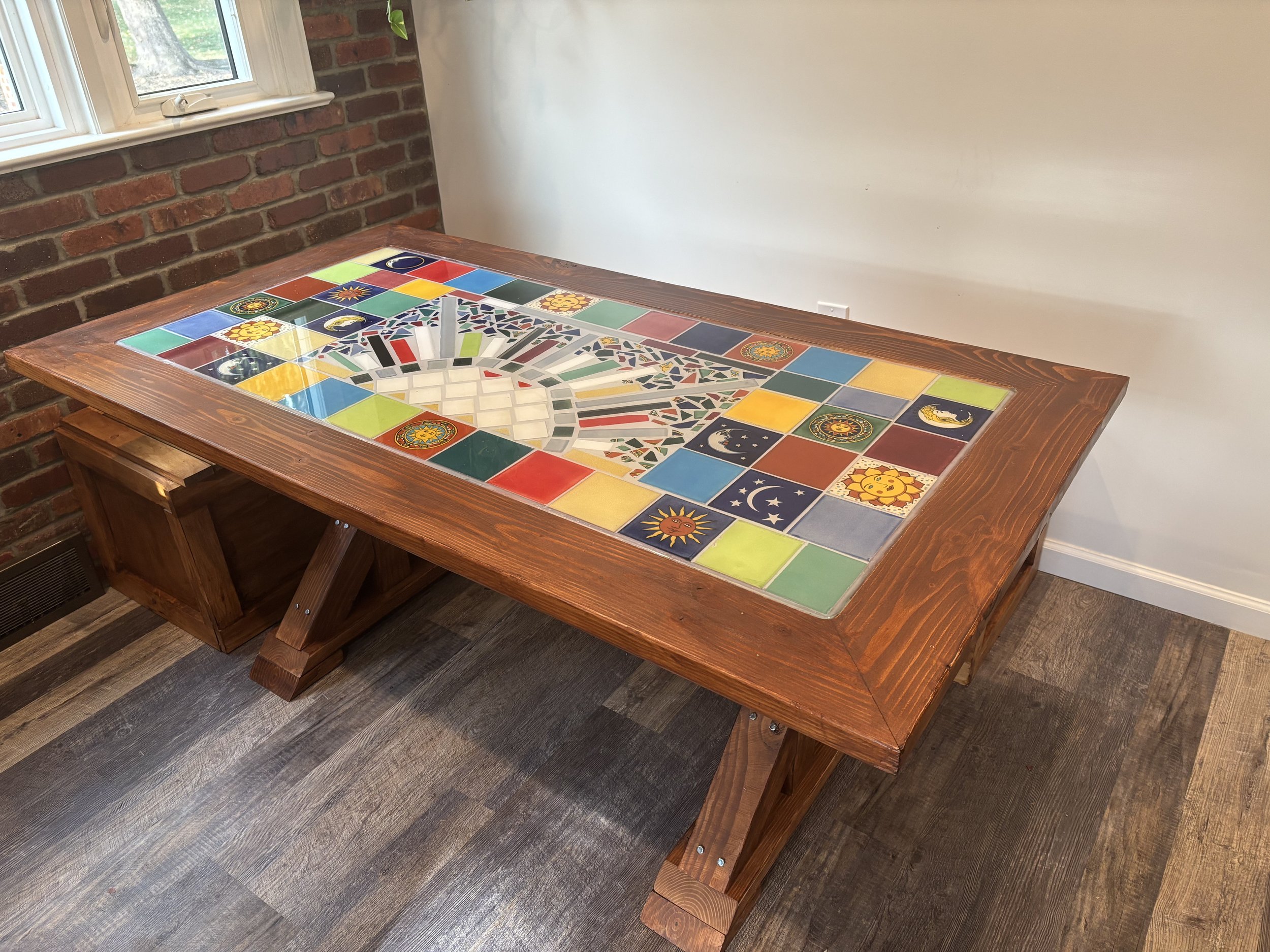 This handcrafted farmhouse table features a vibrant mosaic tabletop made of hand-painted terracotta tiles. Covered with durable epoxy, it blends artistic charm with everyday practicality, supported by a sturdy wood base.