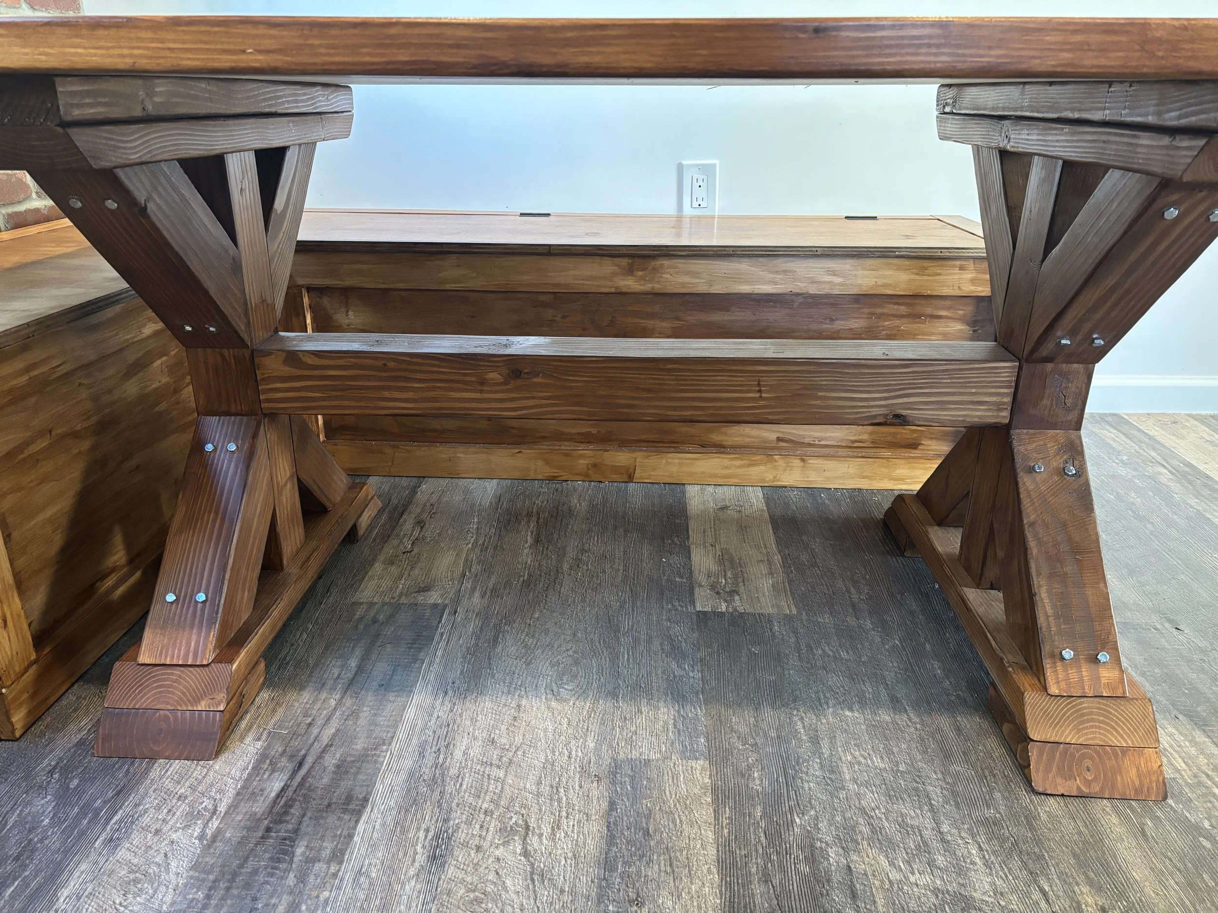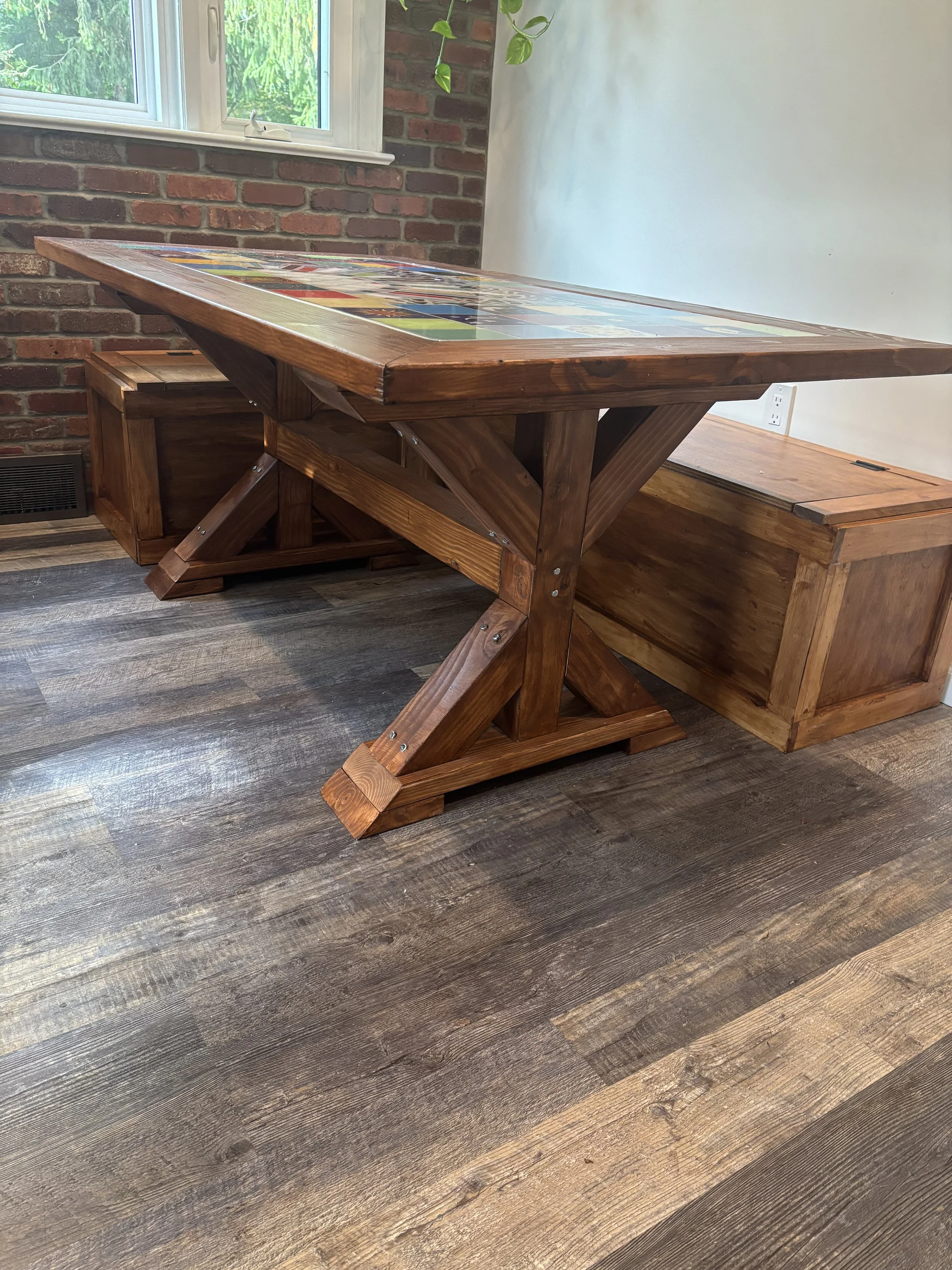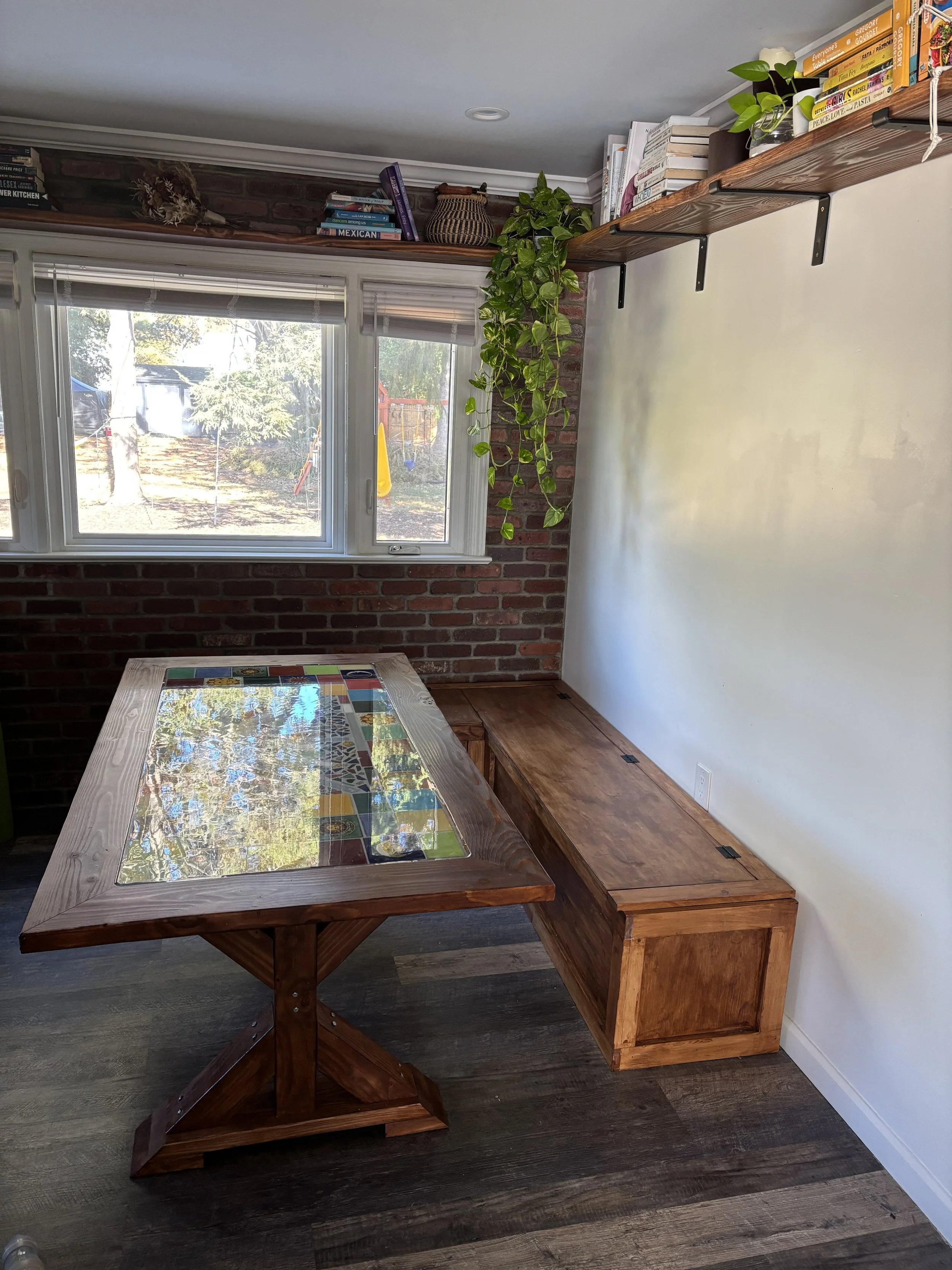 This client wanted a matching kitchen set to enhance a cozy eating area. The centerpiece is a sturdy farmhouse table with a one-of-a-kind tabletop, built to withstand the hustle of a busy family of five.